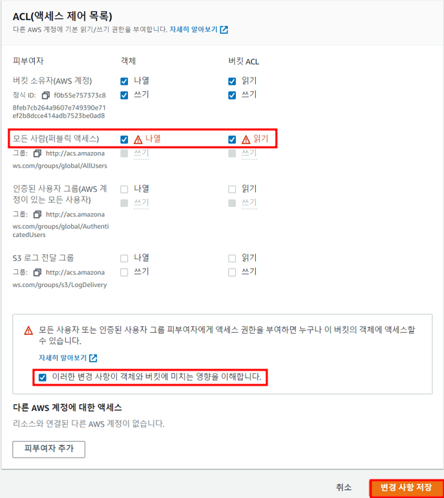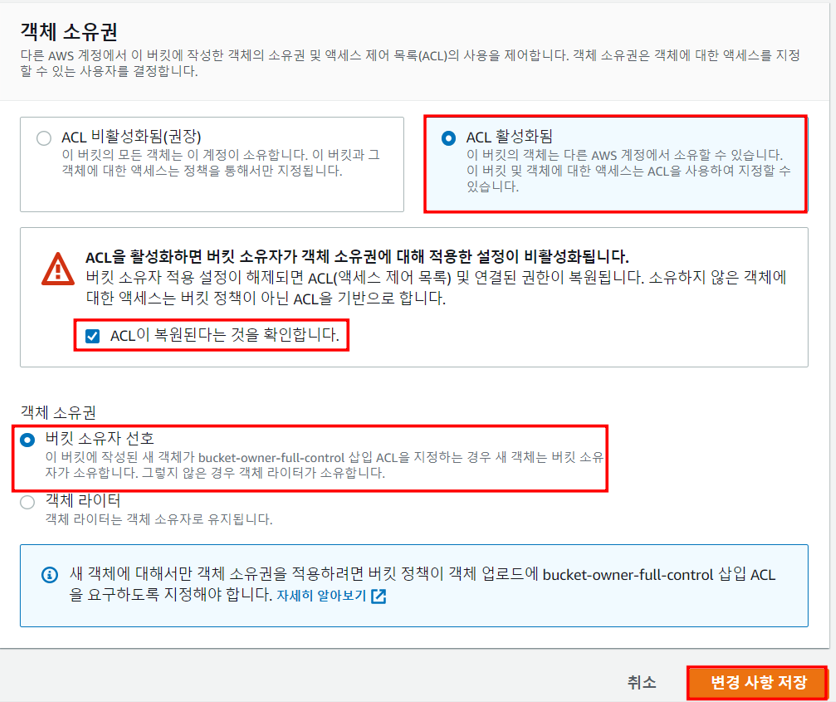 - ACL을 비활성화 하면 소유자만 버킷의 객체를 가질 수 있다