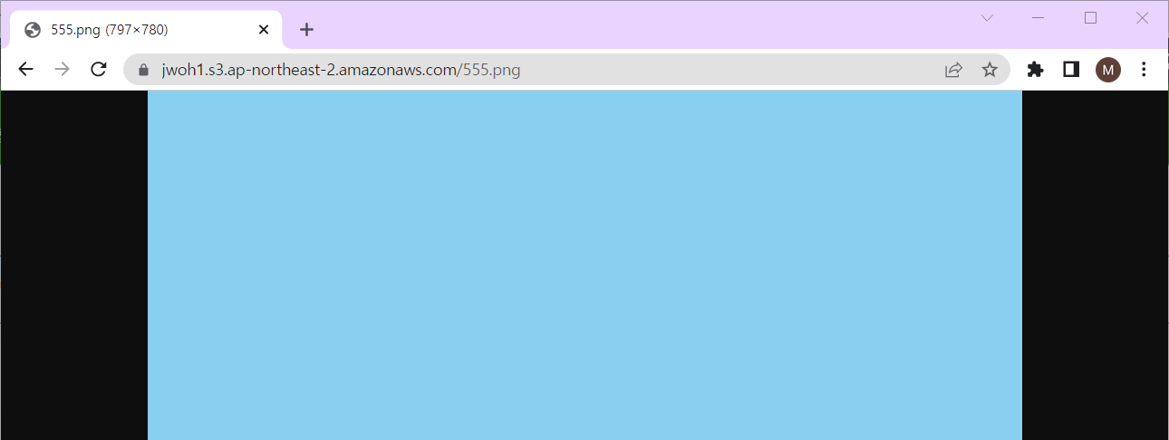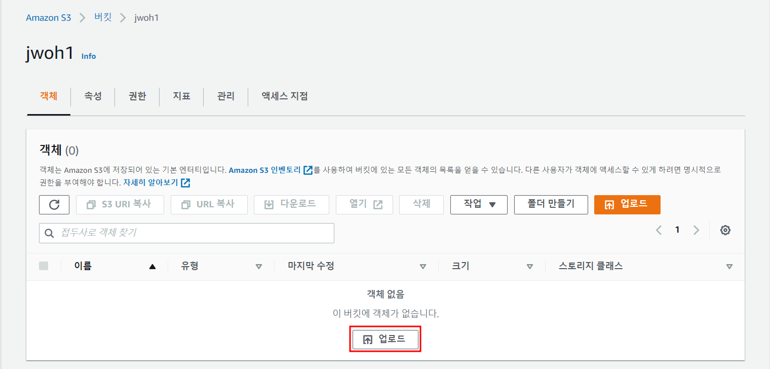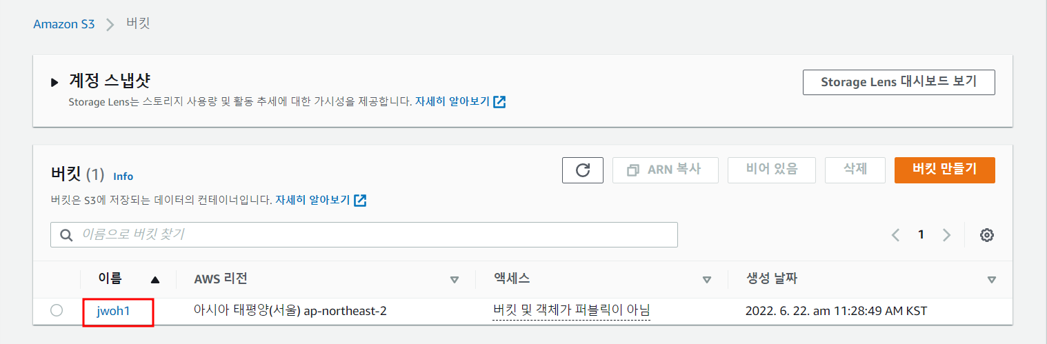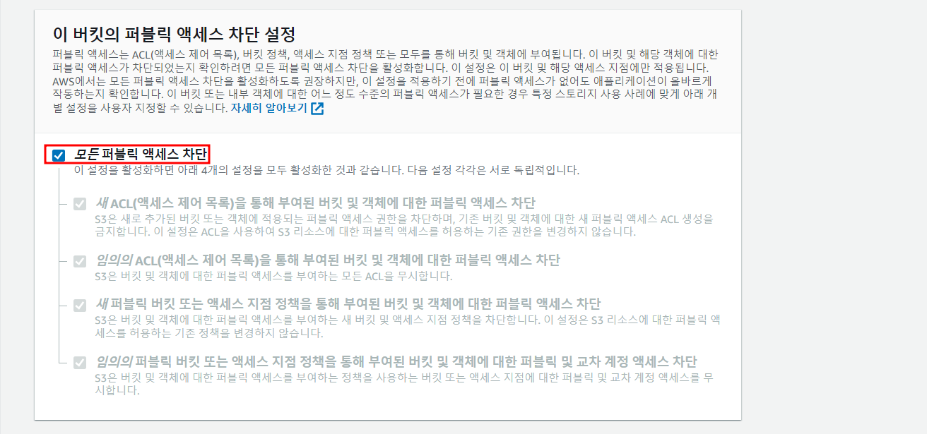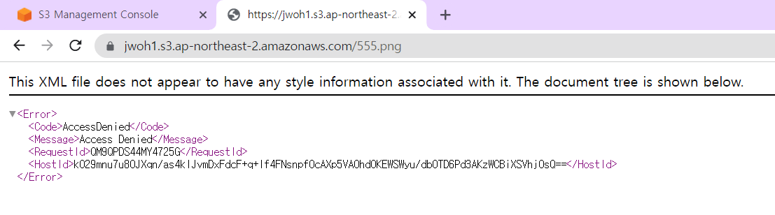 - 버킷을 생성 할 때 Public Access를 허용하지 않았기 때문에 객체 URL 접속 불가