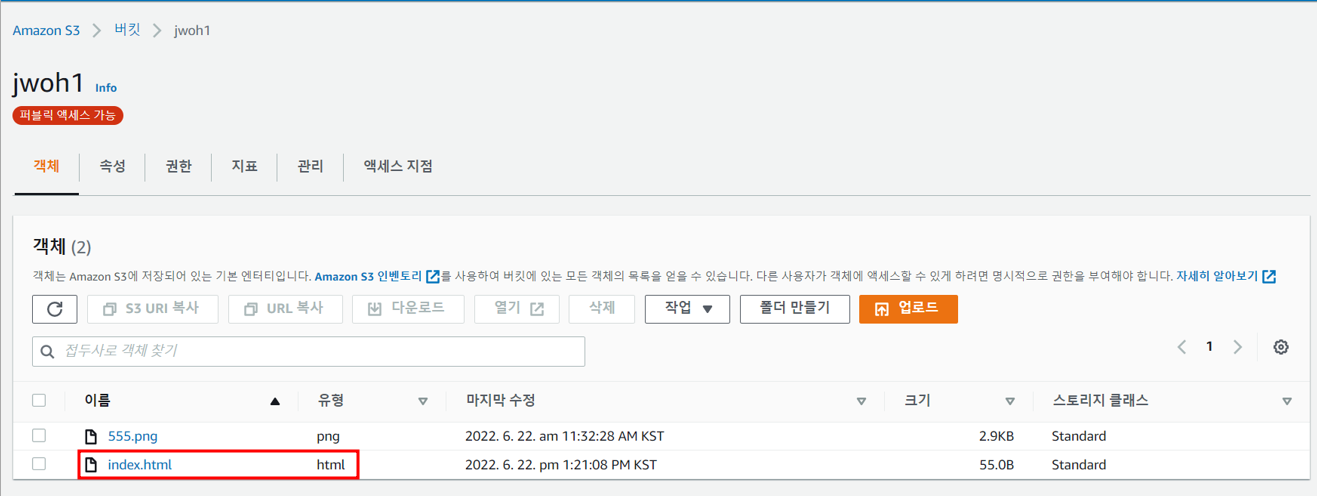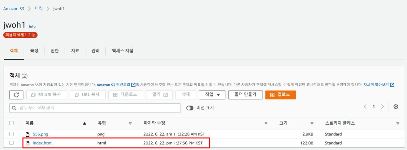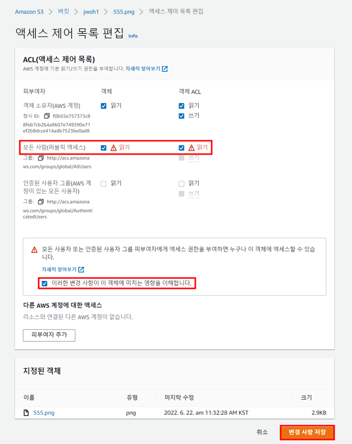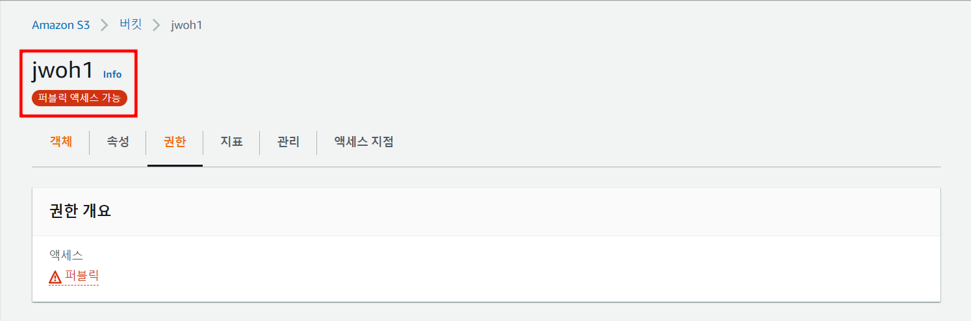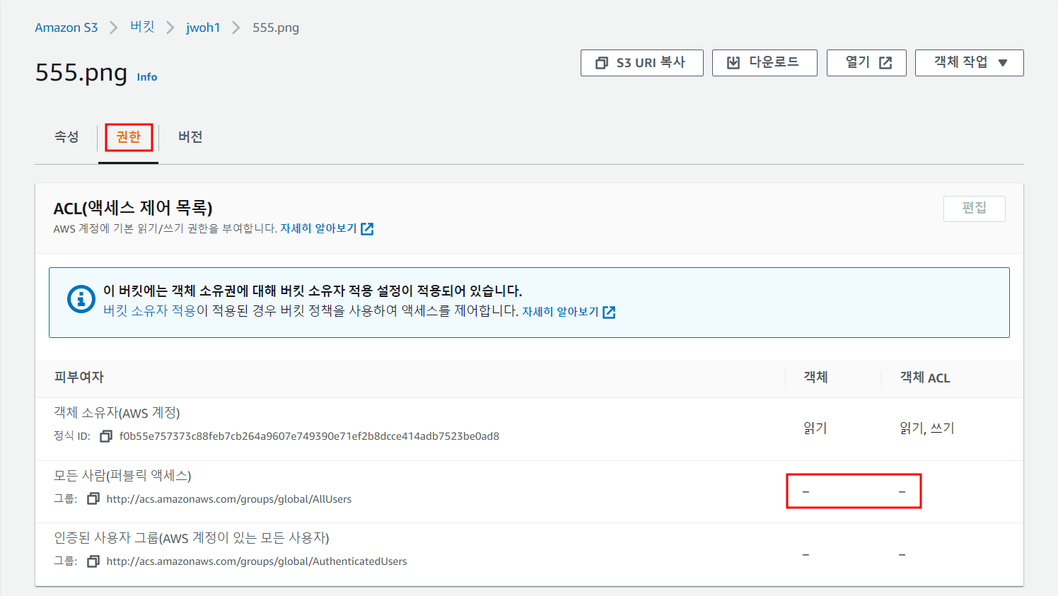- 객체의 권한에서 모든 사람(퍼블릭 액세스)가 읽기권한이 없는것을 확인 가능