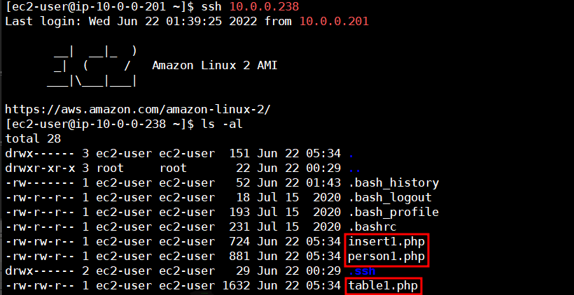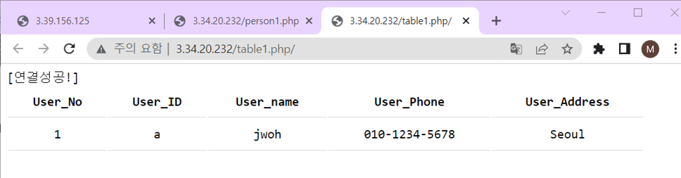 - 두번째 인스턴스에서 insert1.php, table1.php, person1.php 파일 연결 후 확인