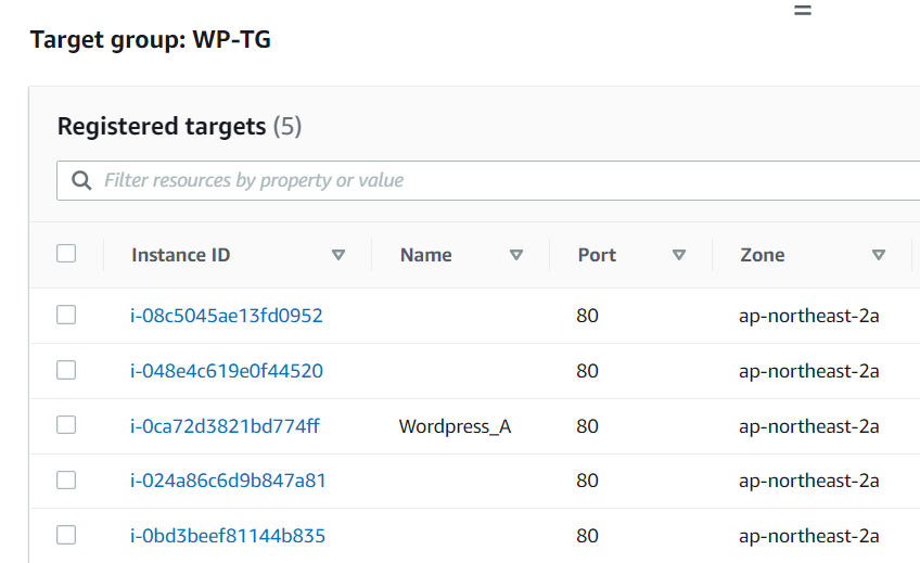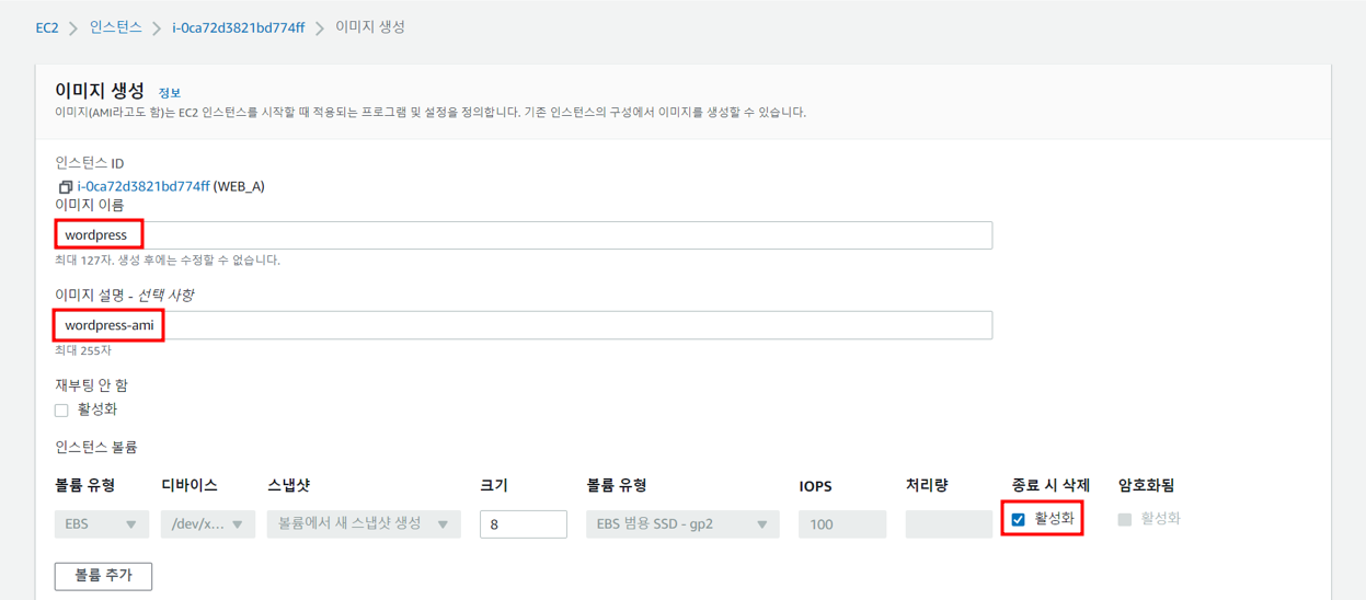- Wordpress_A 인스턴스로 이미지를 만들었기 때문에 Auto Scaling 그룹으로 인해 생기는 인스턴스들은