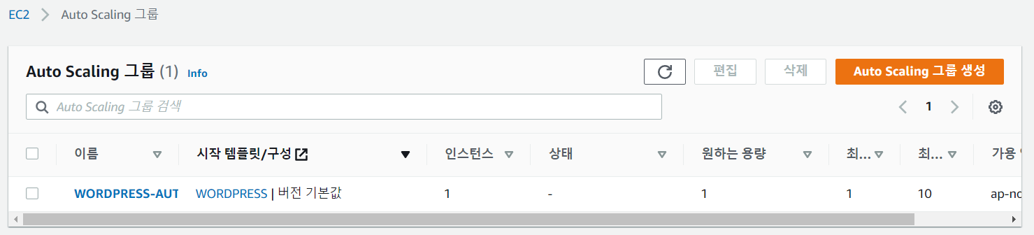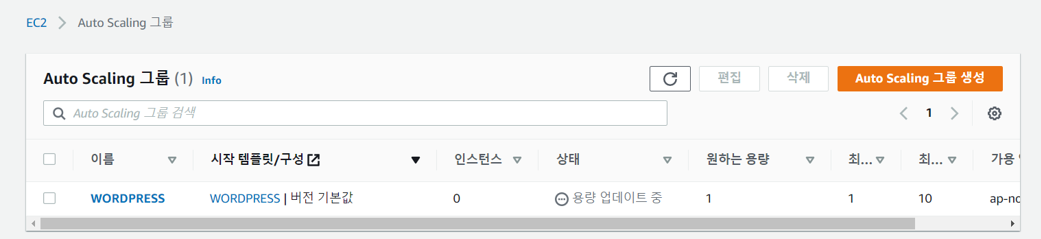 - Auto Sacling 그룹을 생성시 설정한대로 1개의 인스턴스가 생성됨