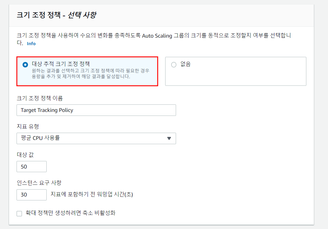 - 대상 추적 크기 조정 정책을 활성화 해야 실습 진행 가능