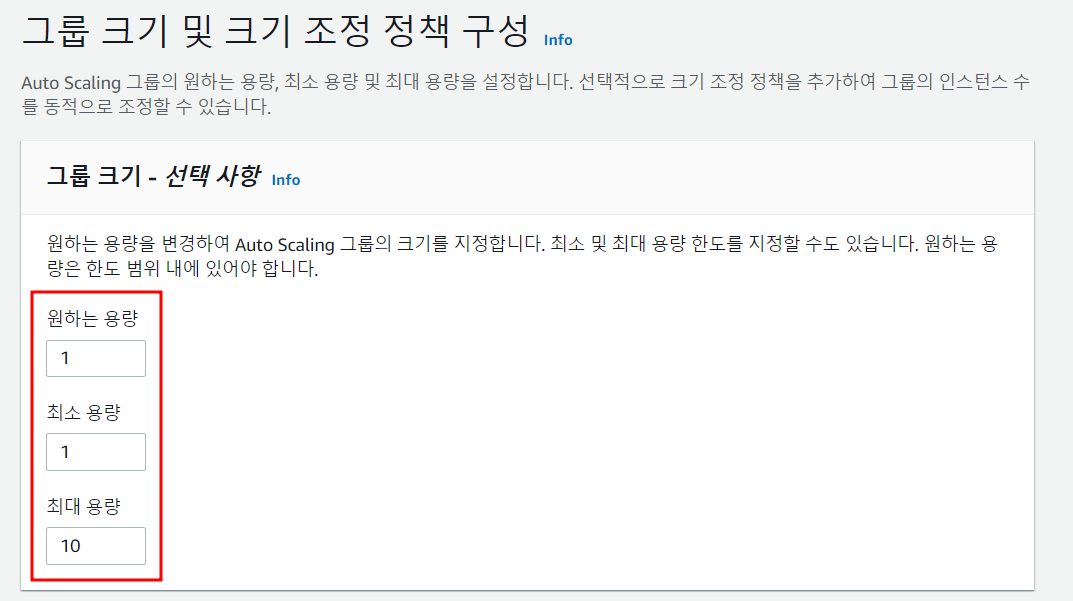- 최소 용량 : 1 (인스턴스가 생겨날 시 용량 1)