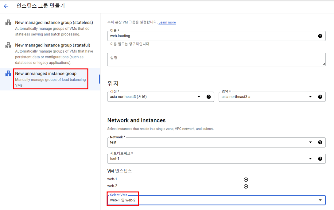 - 로드밸런서에 인스턴스를 넣기 위해서는 인스턴스 그룹 필요