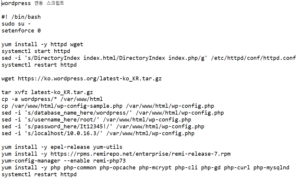 - wordpress 연동 실습 시 wp-config.php 파일의 수정 부분의 단어는 고유하기 때문에 sed 명령어로 수정시 자동화 가능