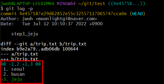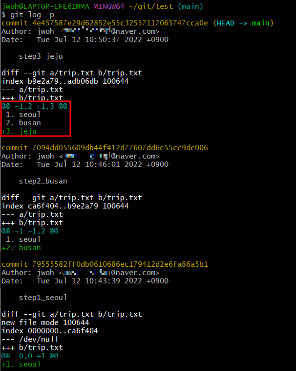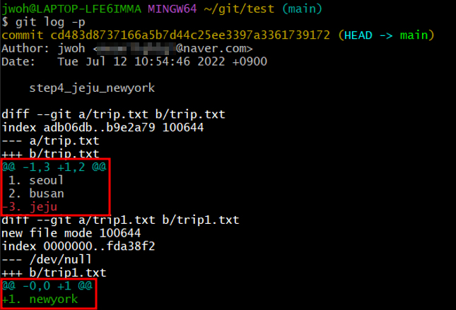 - [git log -p] : commit한 버전끼리의 차이점 출력