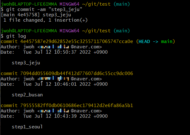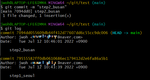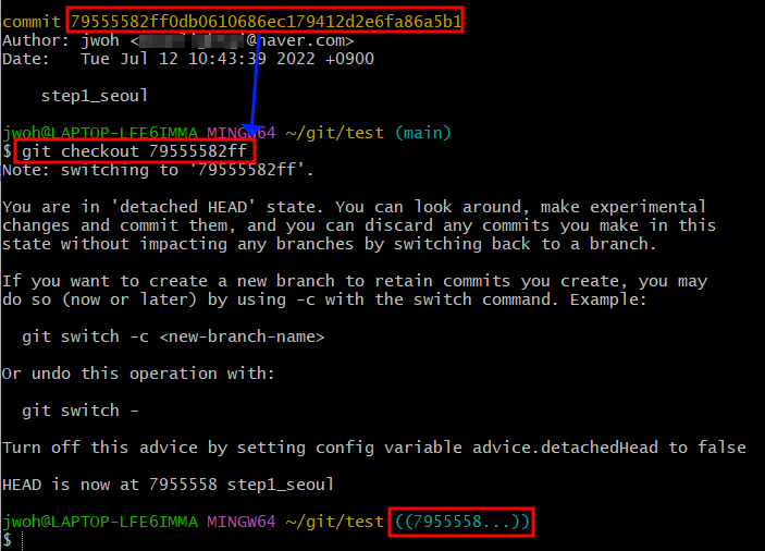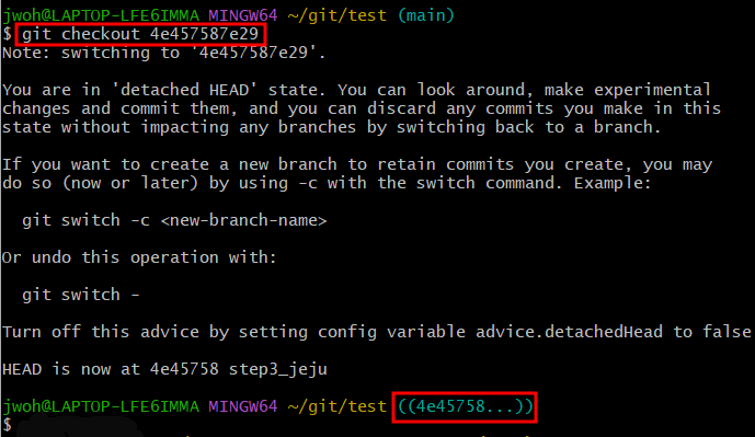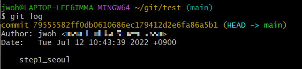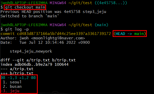 - [git checkout main] : 현재(main)으로 복귀 가능(head를 main으로 맞춰주기)