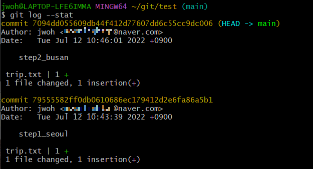 - git log --stat 옵션 사용 시 변화 확인 가능