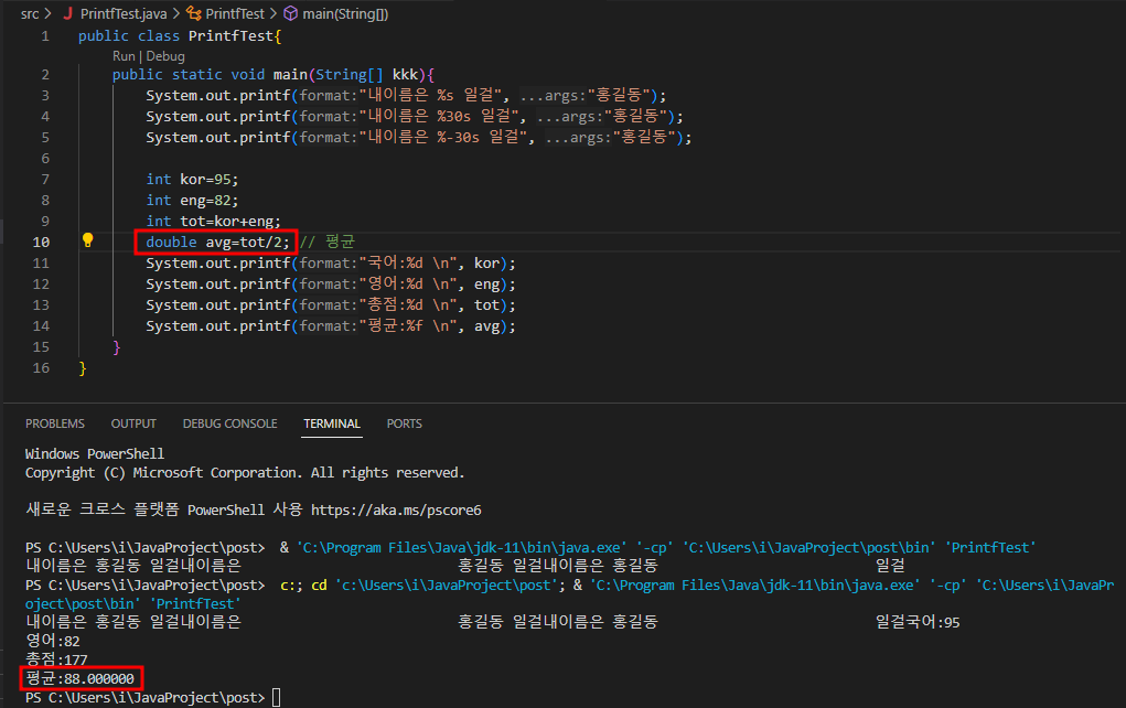정수2를 double로 선언해주면 정수2가 2.0으로 선언되면서 평균이 제대로 나오게 됨