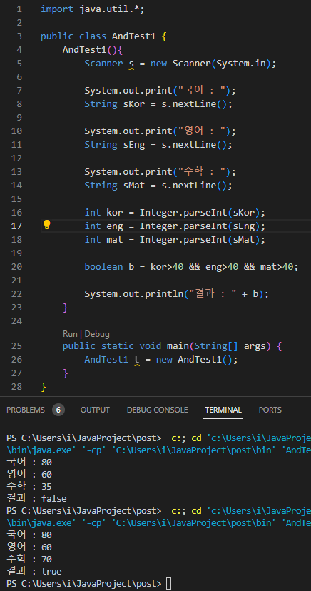 1) 국어, 영어, 수학 세 과목 모두 40점을 초과할 때 참을 도출하는 코드