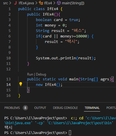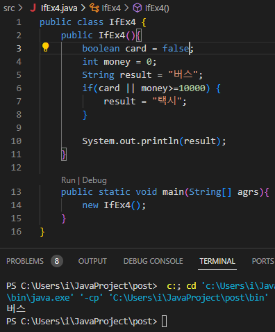 4) 카드가 있거나 현금 10000 이상이 있다면 택시를, 없으면 버스를 출력하는 코드