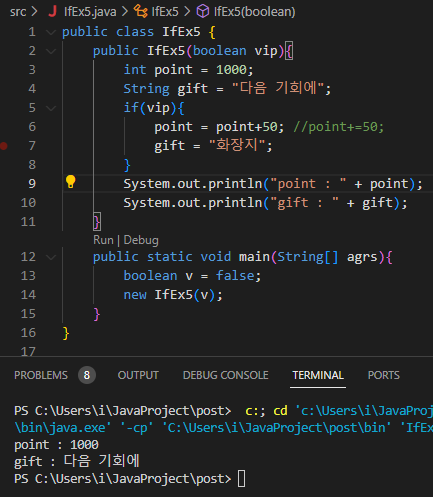 5) vip라면 50 포인트를 추가하고 gift를 주고, 아니라면 "다음을 기약해 주세요" 출력하는 코드