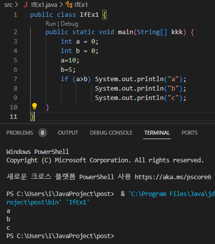 > a, b, c 모두 출력 (그러나 조건문은 a만)