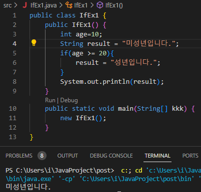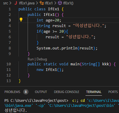 1) age가 20 이하이면 "미성년입니다" , age가 20 이상이면 "성년입니다"를 출력하는 코드