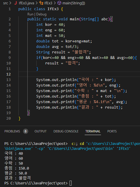 3) 세 점수가 40 미만이거나 평균이 60 미만일 시 불합격을 출력하는 코드