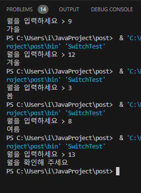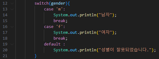switch문에서는 중괄호를 생략하고 break; 를 사용함 (break문을 만나기 전까지 조건이 실행됨)