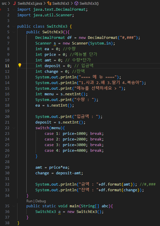 3) 선택 메뉴와 입금액에 따른 잔액 반환 프로그램