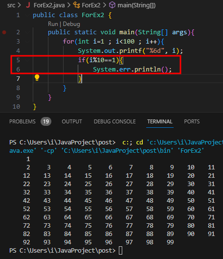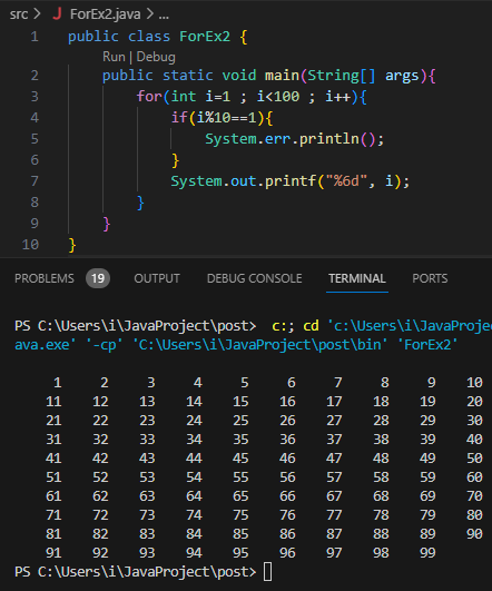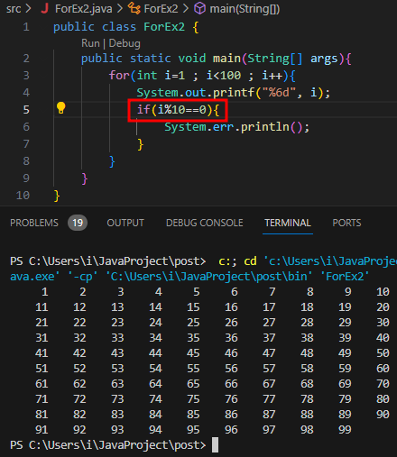 2) 줄바꾸기 : 만약 i를 10으로 나눈 나머지가 1이라면 줄을 바꾸라는 명령어