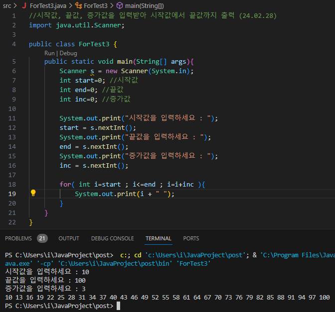 3-2) 시작값, 끝값, 증가값을 입력받아 출력