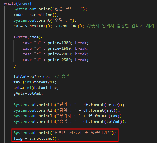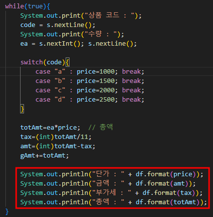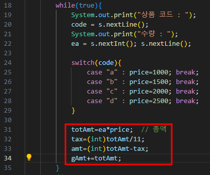 6) 계산식 세우기 (금액과 부가세는 총액을 기준으로 나오기 때문에 총액 값이 먼저 필요하다)