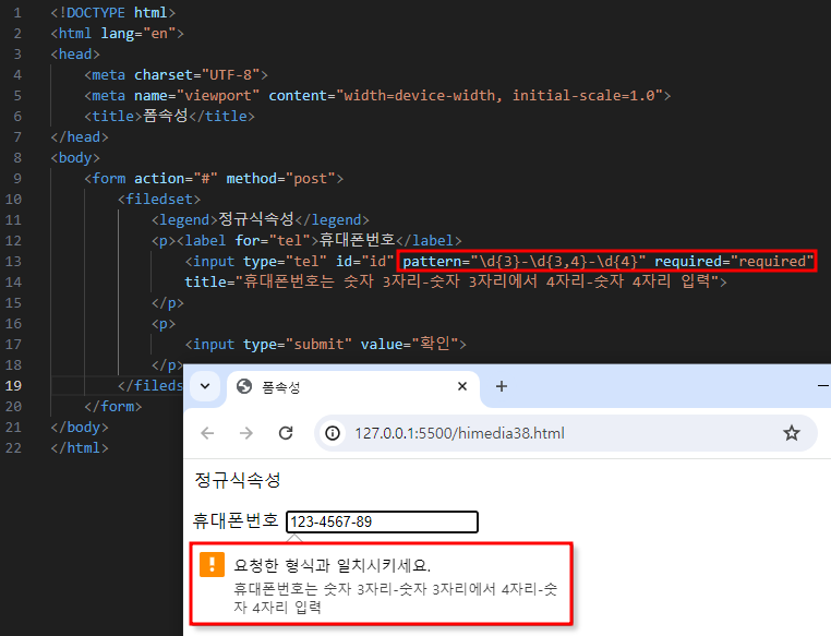 pattern : 지정한 문자패턴(정규식)과 입력된 내용의 일치여부 확인