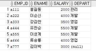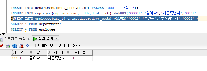 * 삭제시에는 관련된 외래키 먼저 삭제 후 가능 (employee에 외래키가 있기 때문에 employee먼저 삭제 후 department 삭제 가능)