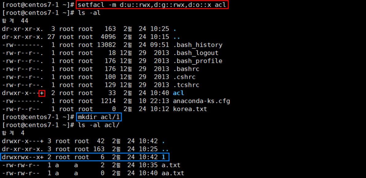 * 기본값 설정 : setfacl -m d(default):(u,g,o,): :r,w,x(권한)