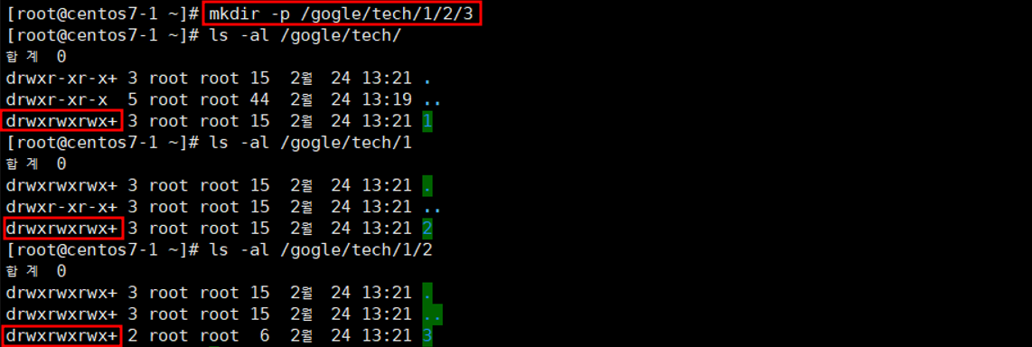 9. [mkdir -p tech/1/2/3] 작업 후 하위 디렉토리 권한 상속 확인