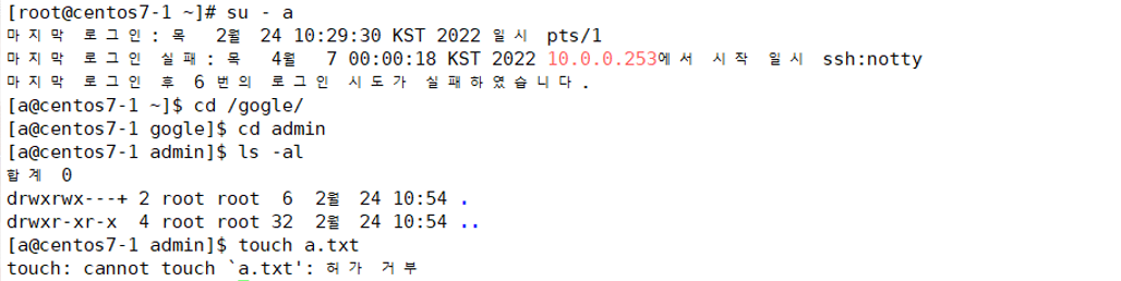 4. [setfacl] 명령어를 사용해 /gogle/admin 디렉토리에 접근할 수 있는 사용자를 설정