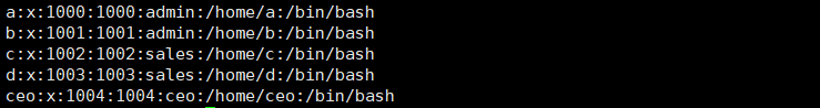 2. 사용자는 a, b, c, d, ceo이며 a와 b는 admin 소속, c와 d는 sales 소속