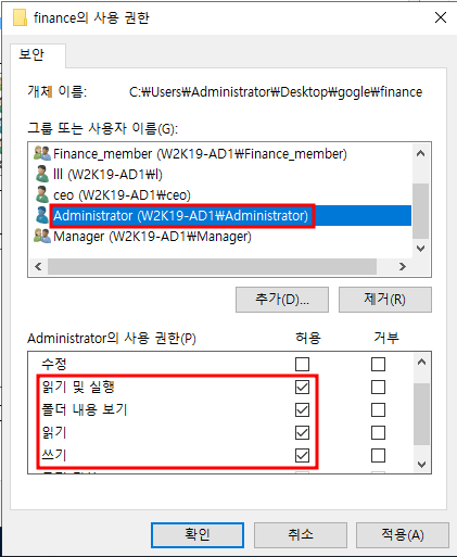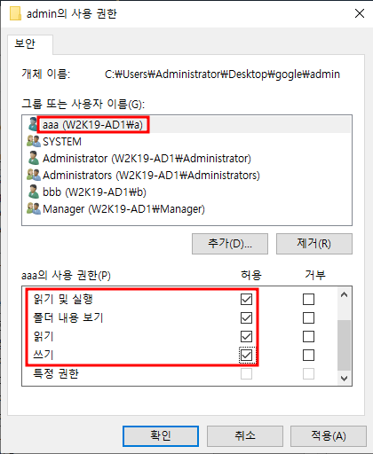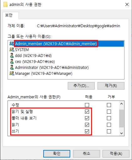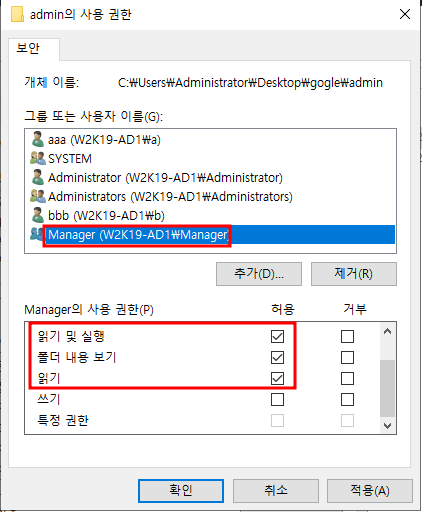 - 윈도우 서버에서 읽기는 읽기 및 실행을 의미합니다.