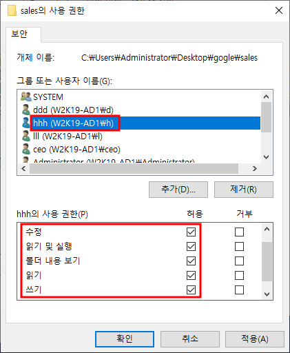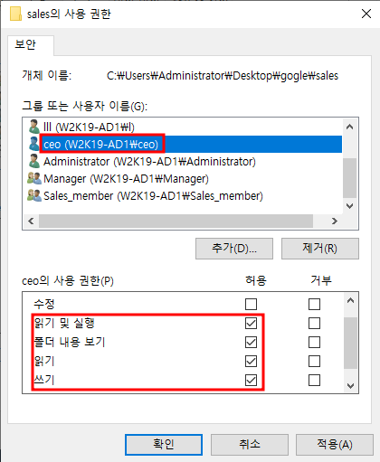 14. sales 부서 폴더도 동일하게 상속 제거 후 사용자 추가 및 권한 부여