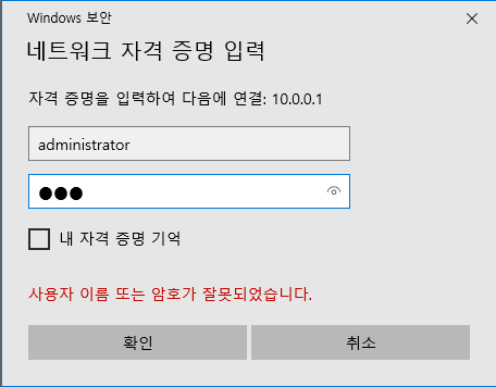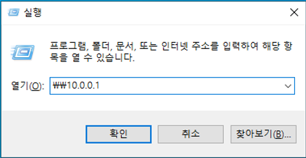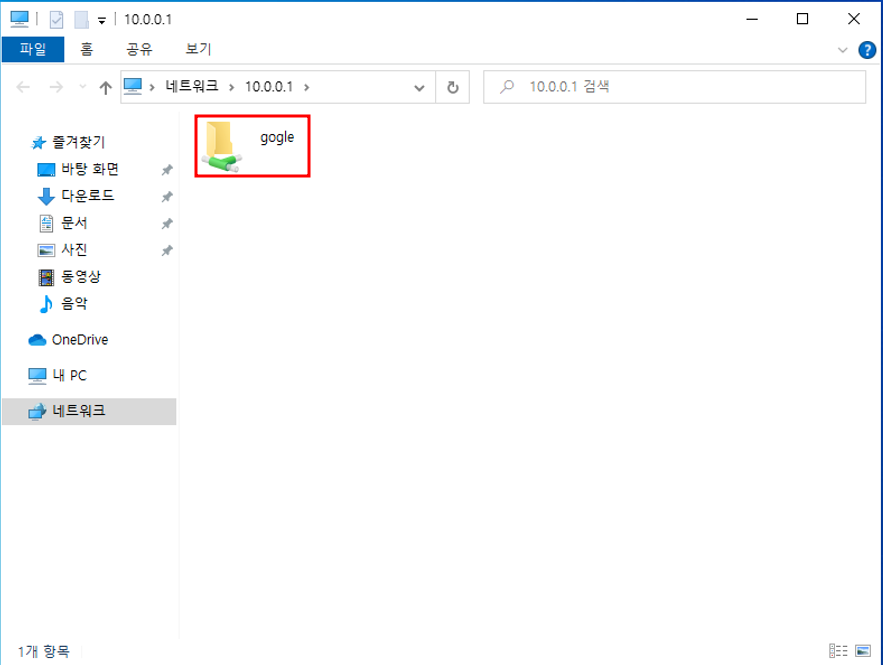 7. gogle 파일에 접근 가능 여부 확인을 위해 가상머신 w10-1에서 실행창 열고 10.0.0.1에 접속 시도