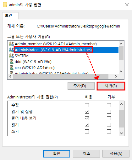 ** Administrator은 기본적으로 Administrators 그룹에 속해있기 때문에 그룹을 제거하고 진행