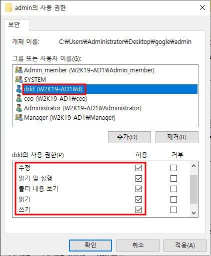 공유 : 변경 / 보안 : 쓰기 → 쓰기 적용