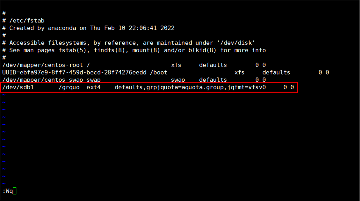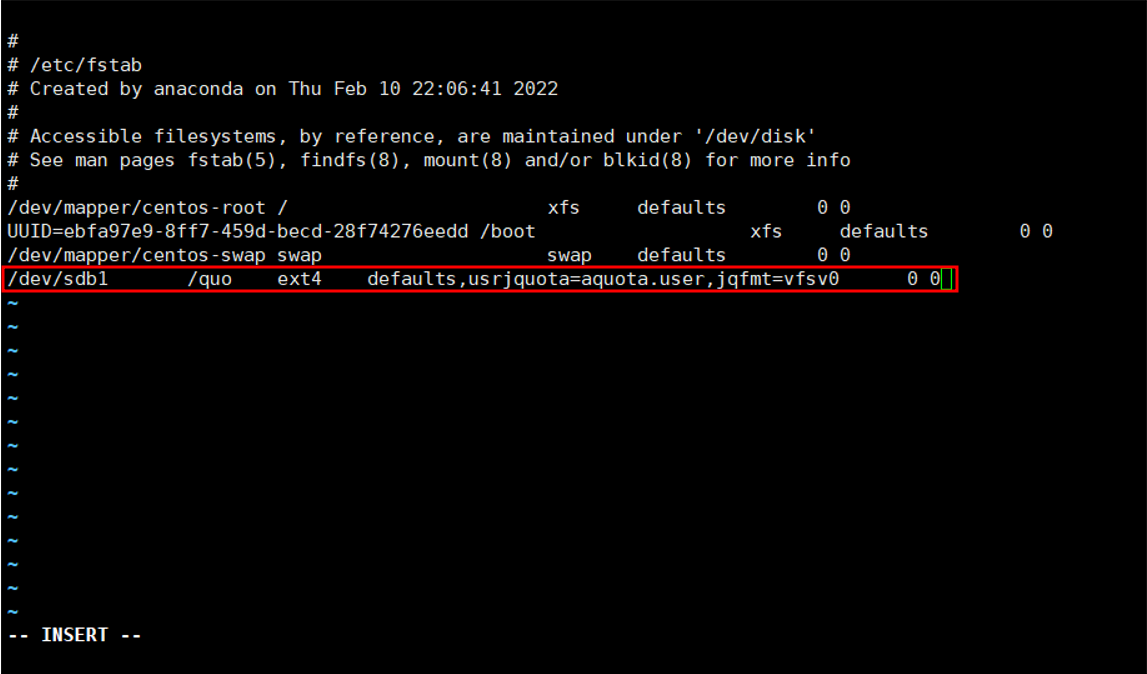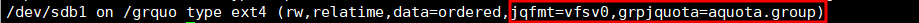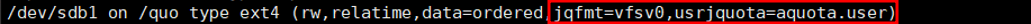 ex) 장치명 마운트포인트 파일시스템형식 defaults,usrjquota=aquota.user,jqfmt=vfsv0 0 0