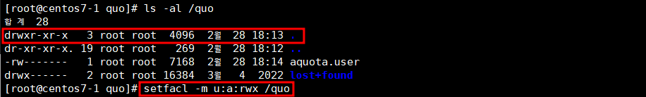 11. quota 디렉토리에 대해 일반사용자에게 모든 권한을 부여합니다. (쓰기 권한 없으면 복사 불가능)
