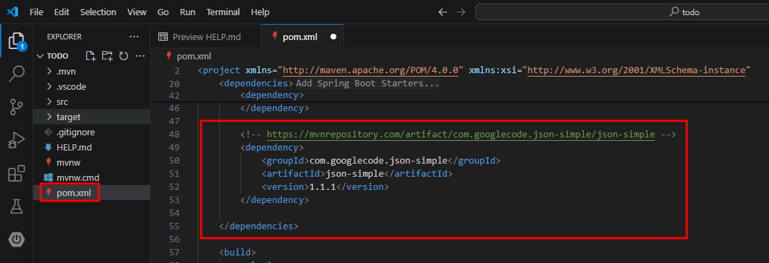 b. json.simple로 검색한 후 xml 코드(dependency)를 pom.xml에 복사