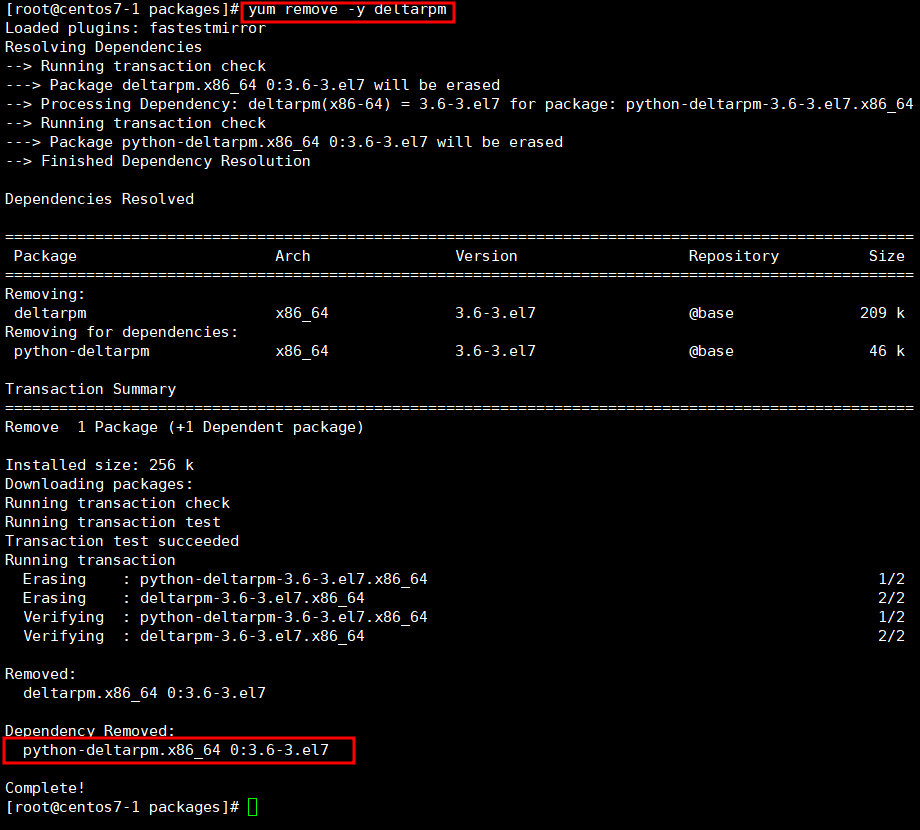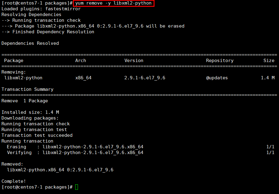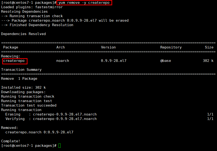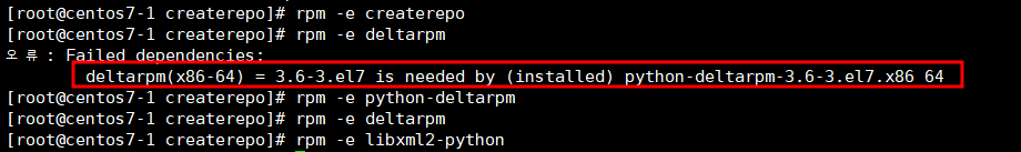 6. [yum remove -y] 명령어를 사용해 createrepo 패키지를 삭제해봅니다