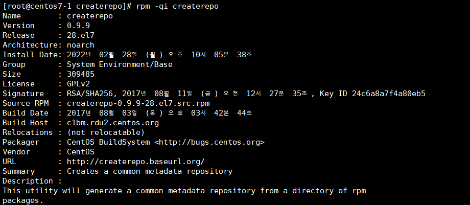 5. [createrepo --version] 명령어로 설치를 확인해줍니다