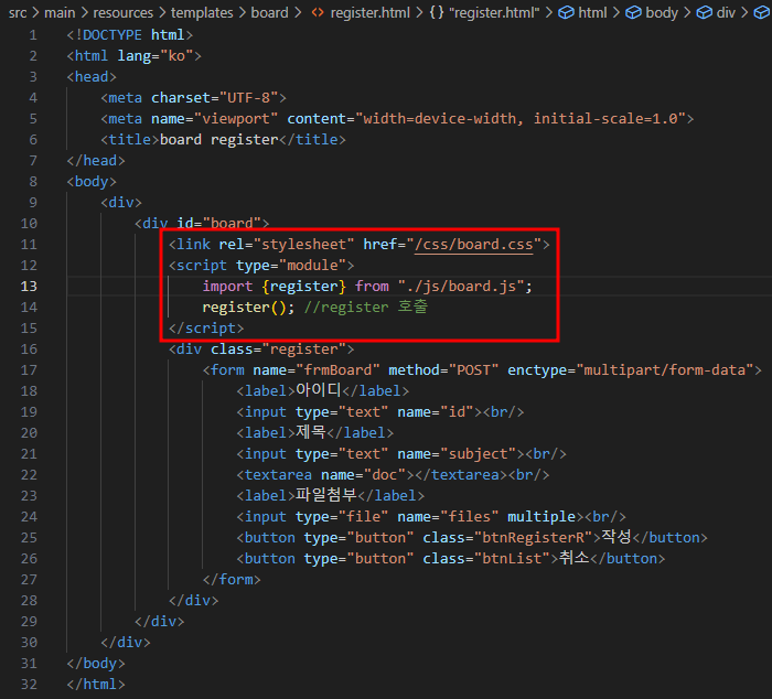id=board만 잘라서 적용하기 위해 css와 script를 head에 넣지 않고 board에 넣음