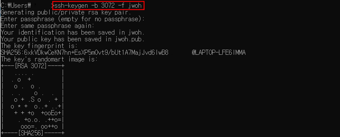 1. cmd 창을 열어 [ssh-keygen] 명령어를 사용해 3072 bit짜리 rsa방식의 키 생성 (bit가 높을 수록 안전)