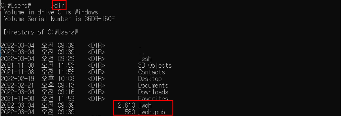 2. [dir] 명령어를 사용해 생성된 키 확인