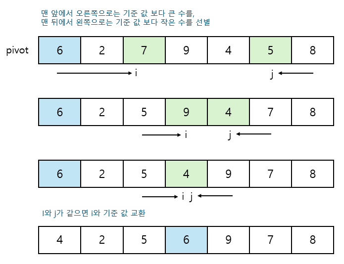 - 한번 정렬 후 기준 값 왼쪽에는 기준값보다 작은 수만, 오른쪽에는 기준 값보다 큰 수만 존재