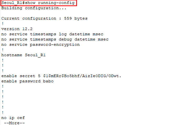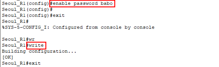 - Router(config)# enable secret : 유저모드에서 관리자 모드 진입 시 password 설정 - 암호문 (평문보다 우선)