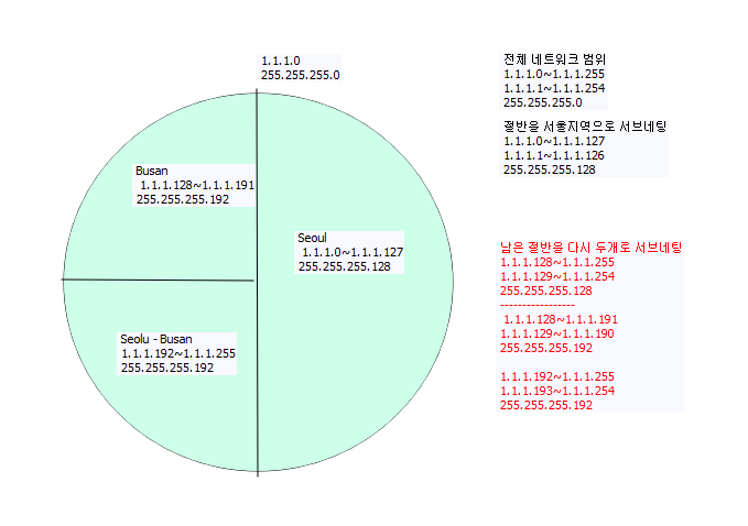 - 부산은 Defualt Gateway 포함 100개의 IP를 사용중이기 때문에 네트워크와 브로드캐스트 IP를 더하면 102개의 IP가