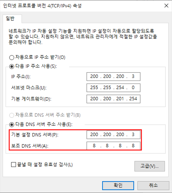 4. DNS는 4번째 서버와 Kornet DNS(168.126.63.1)을 사용중입니다.