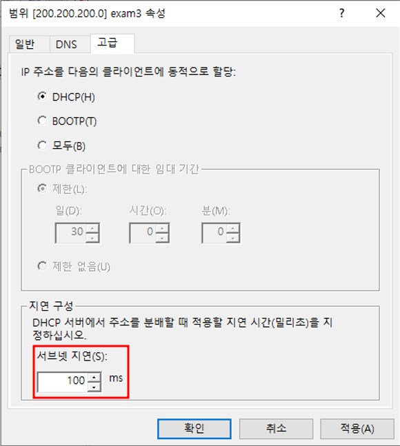 10. Windows Server의 DHCP설정 중 Offer Message 지연시간 100 입력