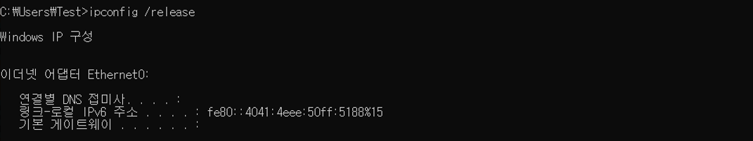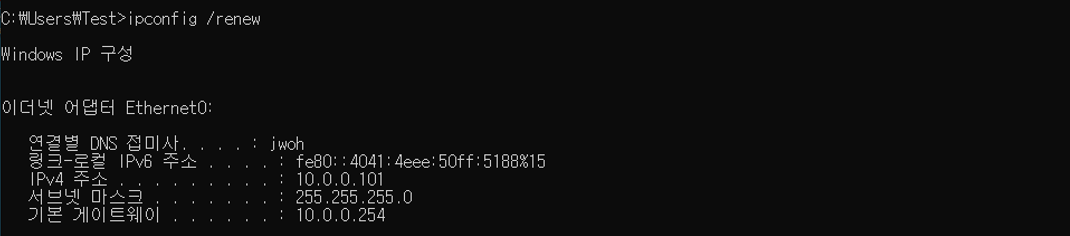 - ipconfig /renew 명령어로 새로운 IP 할당